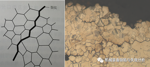 多晶體金屬斷裂時,裂紋擴展的路徑可能是不同的。根據裂紋擴展路徑,金屬的斷裂可分為穿晶斷裂和沿晶斷裂。穿晶斷裂的裂紋穿過晶內,沿晶斷裂的裂紋沿晶界擴展,如圖4、圖5所示。穿晶斷裂和沿晶斷裂有時可以同時發生。