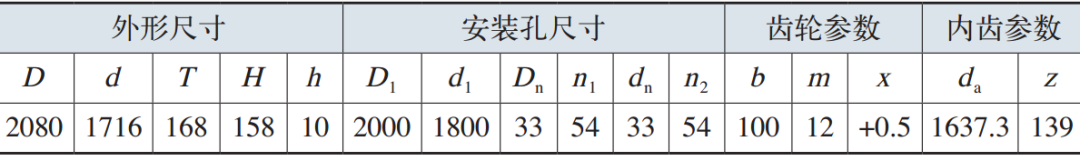 本文進(jìn)行失效分析的對象包括軸承內(nèi)圈(2塊,其中一塊含有裂紋)、軸承外圈(2塊)、滾子(10個(gè)),分析變槳軸承樣塊的外觀尺寸,可確定該軸承為內(nèi)齒雙排同徑四點(diǎn)接觸球軸承。測得外圈高度H=158mm,外圈安裝孔直徑Dn=33mm,內(nèi)圈安裝孔直徑dn=33mm,鋼球直徑Dw=40mm。參照GB/T 29717—2013《滾動(dòng)軸承風(fēng)力發(fā)電機(jī)組偏航、變槳軸承》中表5,可判斷該變槳軸承的型號應(yīng)為FD-033.40.1900.03K。其材料為42CrMo,預(yù)備熱處理方式為調(diào)質(zhì)處理。FD-033.40.1900.03K型軸承的外形尺寸如表1所示。