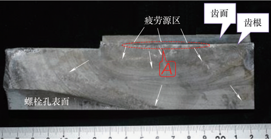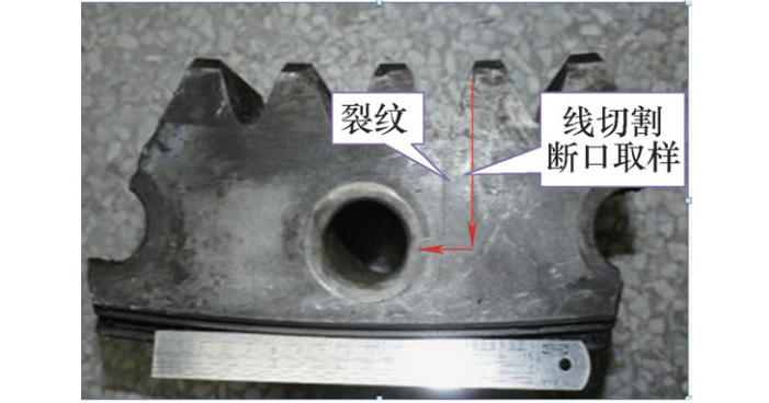 宏觀可觀察到軸承內(nèi)圈螺栓孔附近有一條長約70mm的裂紋,從齒根向滾道方向擴(kuò)展,未完全穿透整個(gè)軸承截面,如圖1所示。用線切割取出裂紋(斷口),經(jīng)清洗后拍照,如圖2所示。從斷口宏觀形貌可以觀察到典型的貝紋線特征,表明變槳軸承為疲勞開裂。從貝紋線走向,可判斷疲勞源位于變槳軸承內(nèi)圈輪齒的齒根處。