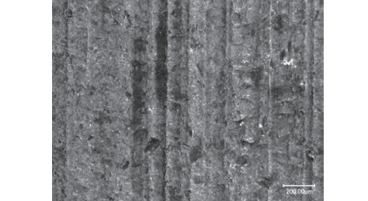 用超景深數(shù)碼顯微鏡分別觀察軸承內(nèi)圈輪齒、軸承套圈滾道以及軸承滾子的表面形貌,其中輪齒表面形貌如圖3所示。圖中的豎直條紋為機(jī)加工形成的表面磨痕,齒輪運(yùn)行過程因接觸疲勞產(chǎn)生了細(xì)小的點(diǎn)蝕坑。