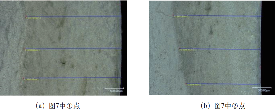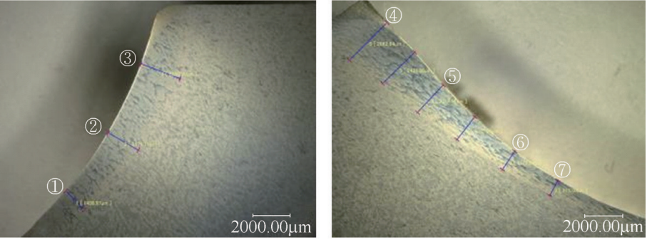 用數(shù)碼顯微鏡觀察淬硬層的低倍金相組織,如圖8所示。分別測量圖7中各點(diǎn)的淬硬層深度,結(jié)果如表3所示。