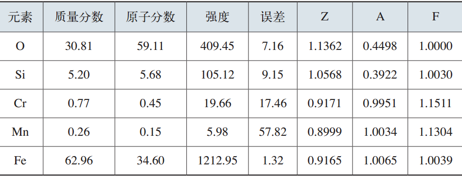 疲勞源從輪齒的齒根處形成,齒根表面有大面積的氧化或腐蝕產(chǎn)物存在,如圖20所示。用能譜分析裂紋源附近齒根的表面成分,其能譜圖如圖21所示,元素定量結(jié)果如表8所示。