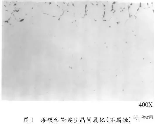 “非馬”組織金相組織觀察的方法通常為試樣不腐蝕或輕腐蝕,但對于具體的操作方法,目前國內尚沒有明確的規范。“非馬”組織通常認為是由于滲碳過程中的內氧化所致。圖1為滲碳齒輪典型晶間氧化。