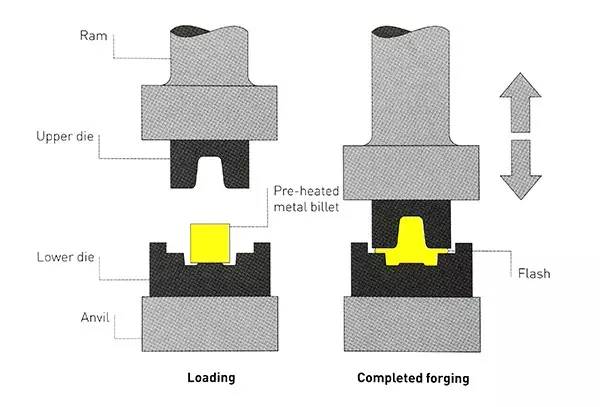 閉合模具鍛造加熱的金屬塊(黃色部分)通過上下模具錘壓成型,用于金屬的快速成型