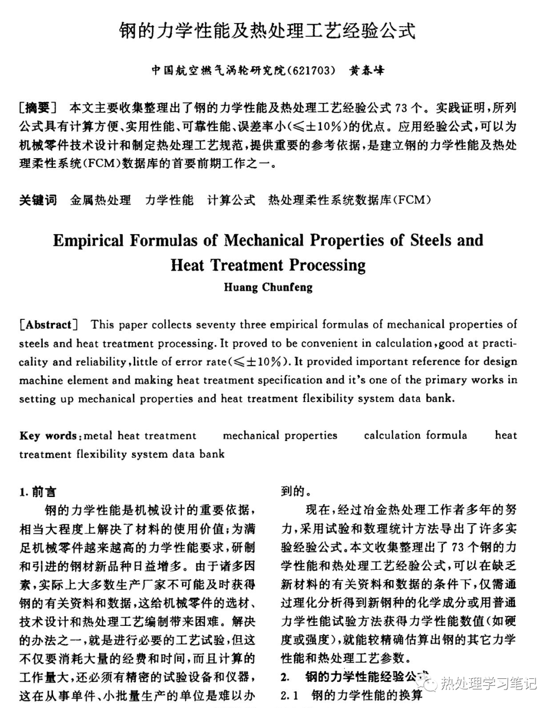 (本平臺"常州精密鋼管博客網"的部分圖文來自網絡轉載,轉載目的在于傳遞更多技術信息。我們尊重原創,版權歸原作者所有,若未能找到作者和出處望請諒解,敬請聯系主編微信號:steel_tube,進行刪除或付稿費,多謝!)大家好!今天分享鋼的力學性能及熱處理工藝經驗公式73個,供大家參考學習!