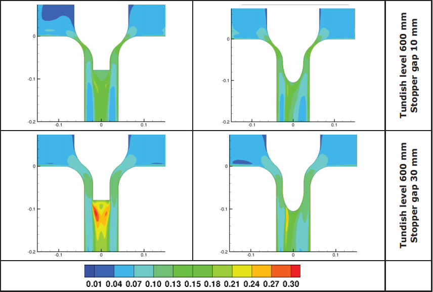 湍流起伏用湍流強度來表示。這個量已經在公式6中引入。圖108顯示了湍流強度,其速度結果數據顯示在圖107中。兩個鋼廠的連鑄機的結果沒有顯著差異。結果與整體速度水平沒有直接聯系,即湍流強度的最大值可以在整體速度最大的情況下觀察到。這些是最大中間包液面高度800mm和最小的塞棒提升10mm情況,在水口下部的速度水平沒有顯示出對湍流強度最大值的影響,湍流強度最大值的位置在塞棒水口間隙中和以及塞棒尖端正下方。