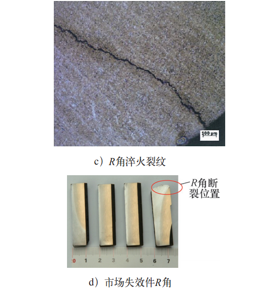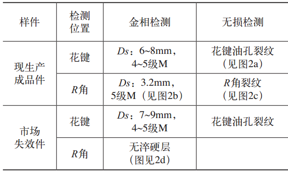 對(duì)現(xiàn)生產(chǎn)成品件和市場(chǎng)反饋的失效件進(jìn)行無(wú)損檢測(cè)和金相分析,試驗(yàn)結(jié)果見表1。從表中可以看,出現(xiàn)生產(chǎn)成品件以及市場(chǎng)失效件花鍵部位的感應(yīng)淬火結(jié)果滿足技術(shù)要求,花鍵部位有效淬硬層深≥5mm,淬硬層金相組織為4~5級(jí)針狀馬氏體。但花鍵油孔處和R角處的感應(yīng)淬火結(jié)果均不符合技術(shù)要求,具體如下:1)現(xiàn)生產(chǎn)成品件的R角位置和花鍵油孔處存在感應(yīng)淬火裂紋。2)R角處的感應(yīng)淬火層深較淺甚至存在無(wú)感應(yīng)淬火層深現(xiàn)象,未達(dá)到技術(shù)要求所規(guī)定的5mm以上。