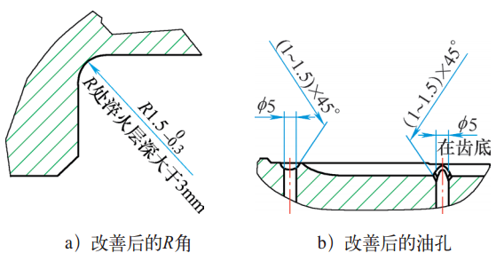 2.1 R角和油孔倒角結(jié)構(gòu)優(yōu)化由以上分析可知,副箱輸出軸斷裂的根本原因在于R角結(jié)構(gòu)及油孔倒角設(shè)計(jì)不合理,因此特制定以下改善措施。1)改進(jìn)過(guò)渡圓角結(jié)構(gòu)為外圓角R1.5mm,優(yōu)化圓角處感應(yīng)淬火層深技術(shù)要求為≥3mm。2)改進(jìn)油孔倒角結(jié)構(gòu)為(1~1.5)mm×45°。圖4a所示為優(yōu)化后的R角結(jié)構(gòu),在感應(yīng)熱處理中,當(dāng)工件的臺(tái)階根部需要進(jìn)行感應(yīng)淬火強(qiáng)化時(shí),臺(tái)階根部需要有過(guò)渡圓角,且越大越好。如此設(shè)計(jì)有良好的工藝性:①減小臺(tái)階根部的應(yīng)力集中,降低使用過(guò)程中的開裂傾向。②降低感應(yīng)淬火難度,臺(tái)階根部受熱均勻,臺(tái)階淬硬層均勻連續(xù),強(qiáng)度顯著提升。圖4b所示為優(yōu)化后的油孔倒角設(shè)計(jì),倒角尺寸增大到(1~1.5)mm×45°,同等加熱情況下,油孔倒角越大,越可顯著減小油孔邊緣的電流密度,降低因過(guò)熱而使油孔邊緣開裂的傾向。