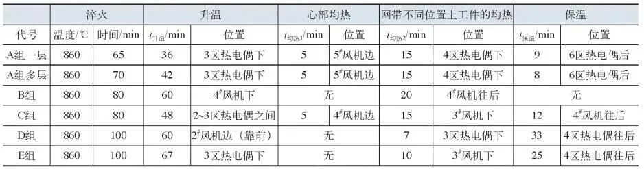 A組1層主要是測試工件在爐內的升溫過程,其他各組都是以爐子的額定產能進料,平鋪在淬火網帶上,以保證測試環境的一致性。5組測試分別按字母A?E進行標記。每種爐子上都測一遍,具體測試分組見表1。