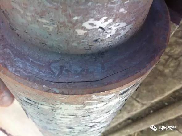 合金鋼采用水空交替淬火,空冷時間控制很重要。如果空冷時間太長,得不到淬火馬氏體,如果空冷時間太短,淬火太劇烈,臺階部位應(yīng)力過大,容易產(chǎn)生淬火裂紋,如圖4所示。工藝試驗必須進行小批量多次試驗,質(zhì)量穩(wěn)定后方可進行批量生產(chǎn)。