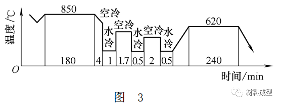 采用水空交替淬火,用清水替代價格昂貴的淬火油,尤其對大型零件,減少一次投入更有實際意義。對環(huán)境無污染,屬于綠色熱處理工藝,水空交替淬火后零件組織和力學(xué)性能都優(yōu)于淬油后零件。工藝的難度在于水空交替淬火的時間控制。基于以上原因我們進行了幾次工藝試驗最終取得成功。具體工藝如圖3所示。現(xiàn)已批量生產(chǎn)300多根,質(zhì)量穩(wěn)定,工藝試驗成功。