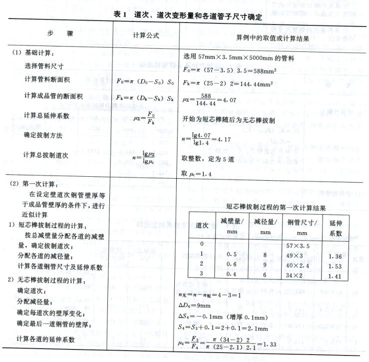 在采用軋拔結(jié)合方案時(shí),可先根據(jù)機(jī)組中冷軋管機(jī)和冷拔管機(jī)的配置以及冷軋管機(jī)已有的孔型系統(tǒng)等具體條件,確定由冷軋轉(zhuǎn)為冷拔時(shí)中間管的尺寸,然后再分別計(jì)算冷軋和冷拔的道次,兩者之和即為總的變形道次。