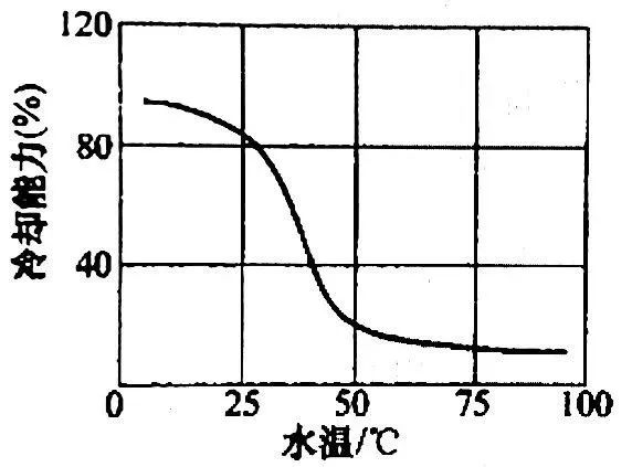 工件在15~25℃內的水中淬火,可以得到相對均勻的冷卻速度分布和較好的穩定性。圖2 所示為在適度攪拌下表面冷卻能力與水溫之間的關系曲線圖。表面冷卻能力隨著水溫的升高急劇下降,所以水的溫升受到限制。在良好的攪拌條件下,可以適當放寬水的溫度上限。