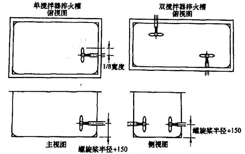 對于矩形淬火槽,當長寬比大于2:1時,可以安裝一個大功率攪拌器,當長寬比遠大于2:1時,就要安裝多個攪拌器,詳見圖12 。