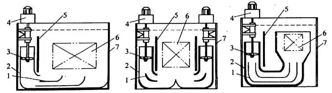 為了使淬火區域內的工件冷卻均勻,就應該使流經淬火區域的工件冷卻均勻,這樣就要采用組合式攪拌器。至于在什么場合下安裝組合式攪拌器和它們在淬火槽的什么位置,并沒有簡單的定量關系,可由設計者依據一定的規律確定。下面介紹一些可參考的基本規律。