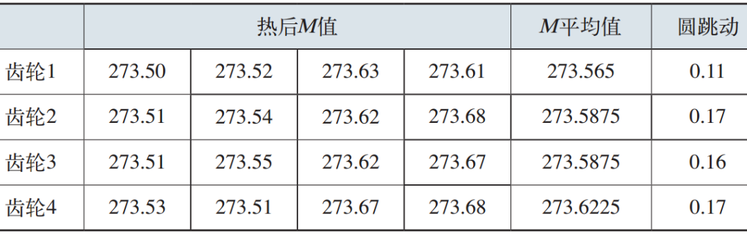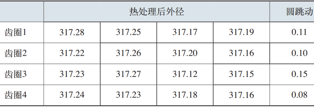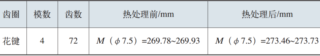 (4)在四件齒圈的端面分別作標記1~4號,經熱處理后測量圓度和內花鍵M值都滿足要求(見表3、表4),其中圓跳動在0.08~0.15mm變動,M值在0.11~0.17mm。表3 外徑熱處理后數據 (mm)