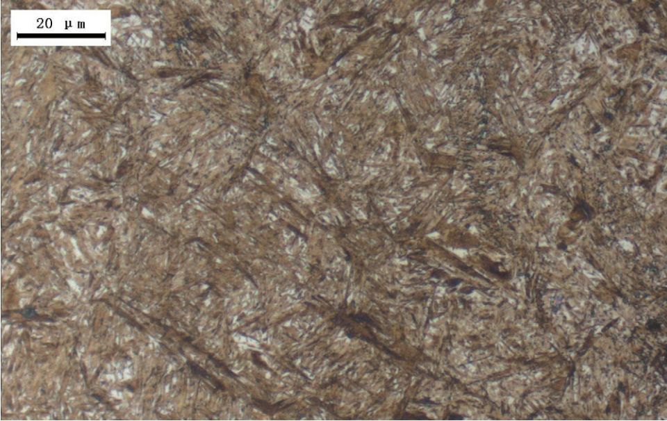 熱處理畸變是零件熱處理后其形狀和尺寸發生變化的一種物理現象。引起熱處理畸變需要具備三個條件:應力、塑性、作用時間。薄壁齒圈的畸變特征主要體現為錐度、圓度、內外徑的漲縮和端面翹曲。(1)粗加工后將零件調質至28~32HRC,這樣既有助于改善可加工性,提高零件表面加工精度,又能最大限度地減少粗加工中產生的殘余應力,為后期的滲碳、淬火提供良好的條件,從而控制變形量。(3)滲碳空冷,高溫回火后測量齒圈的外徑,圓度大的增加壓力校圓處理,使齒圈的圓度控制在0.2mm以內。熱處理生產所用工藝:滲碳→高溫回火→校圓→帶心軸淬火→兩次低溫回火→拋丸。檢查試樣用同爐的φ32mm圓棒試樣。(1)滲碳:930℃強滲期2.5~3h,碳勢1.18%CP左右,擴散期1.5h,碳勢0.68%CP左右;降溫至800℃后出爐空冷。(2)高溫回火:650℃保溫2h,冷至550℃出爐。(3)對圓度變形大的齒圈進行壓力校圓處理,使變形量控制在0.2mm以內。(4)帶心軸淬火:溫度800℃,碳勢0.85%CP,保溫時間1.5h,用分級淬火油,淬火油溫65℃,淬火時間1min。(5)兩次低溫回火:根據實測硬度值確定為140℃,保溫4h。(1)組織形態。試樣的顯微金相組織如圖2所示,組織為隱針馬氏體+少量鐵素體+少量殘留奧氏體。