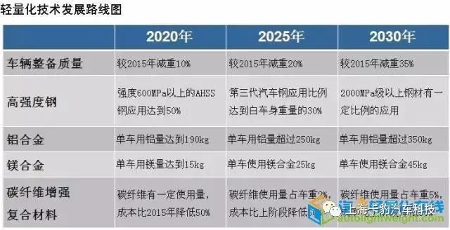 根據去年發布的《節能與新能源汽車技術路線圖》所提出的輕量化技術的發展思路,主要分三個階段實現汽車的逐年減重。第一階段為2016年-2020年,實現整車比2015年減重10%。第二階段為2021年-2025年,實現整車比2015年減重20%。第三階段為2026年-2030年,實現整車比2015年減重35%。