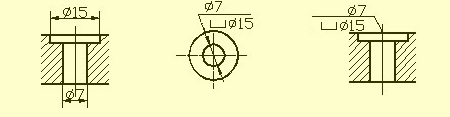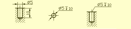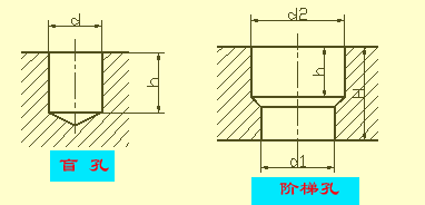 用鉆頭鉆出的盲孔,在底部有一個120°的錐角,鉆孔深度指的是圓柱部分的深度,不包括錐坑。在階梯形鉆孔的過渡處,也存在錐角120°圓臺,其畫法及尺寸注法。
