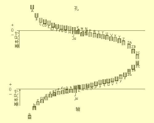 從基本偏差系列圖中可以看出:孔的基本偏差A~H和軸的基本偏差k~zc為下偏差; ,孔的基本偏差K~ZC和軸的基本偏差a~h為上偏差,JS和js的公差帶對稱分布于零線兩邊、孔和軸的上、下偏差分別都是+IT/2、-IT/2。基本偏差系列圖只表示公差帶的位置,不表示公差的大小,因此,公差帶一端是開口,開口的另一端由標準公差限定。