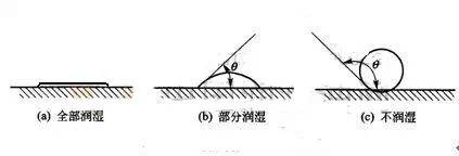 (a)θ=0°,全部潤濕;(b)θ<90°,部分潤濕;(c)θ>90°,不潤濕。