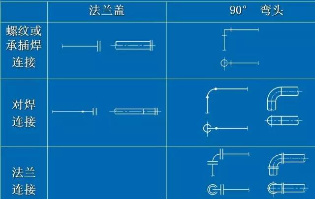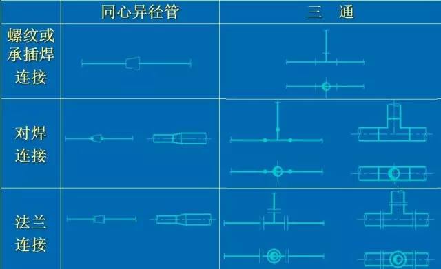 包括短管、彎頭、三通、異徑管、法蘭、盲板等管道附件。通常不畫其真實形狀,只用簡單圖形和符號表示。