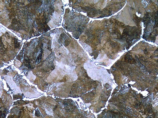 滲碳體是鐵和碳的化合物,Fe3C,其含碳量為6.69%,在合金中形成(Fe,M)3C,滲碳體硬而脆,硬度為800HB。在鋼中常呈網絡狀、半網狀、片狀、針片狀和粒狀分布。