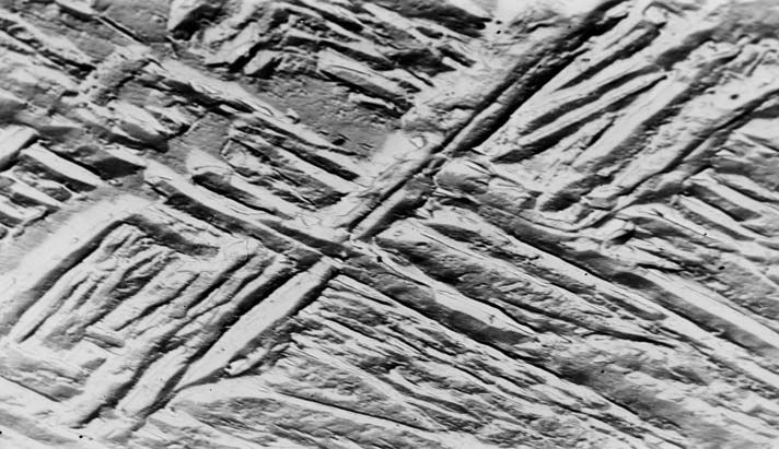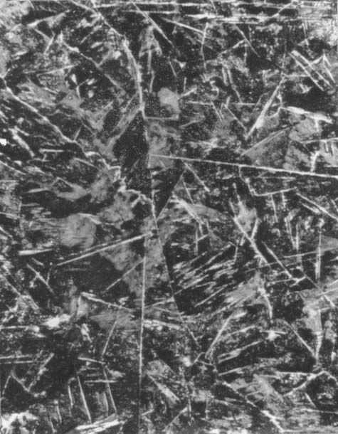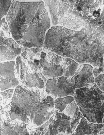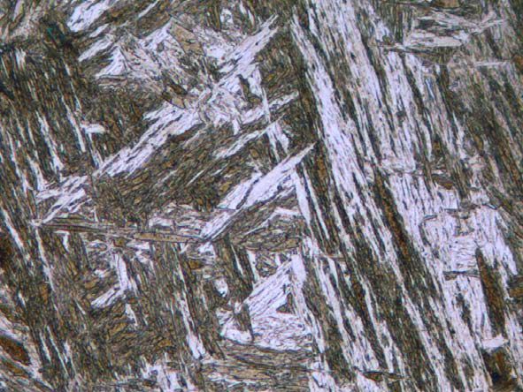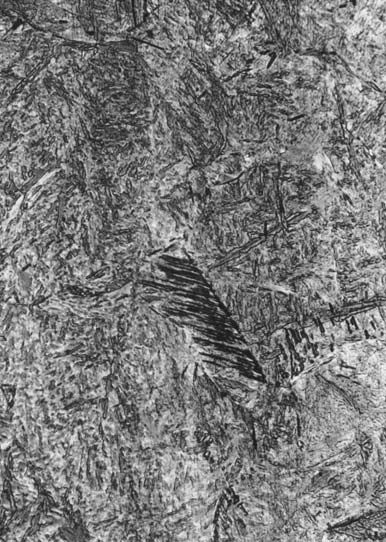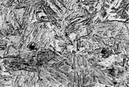 其基本特征是:尺寸大致相同的細馬氏體條定向平行排列,組成馬氏體束或馬氏體領域;在領域與領域之間位向差大,一顆原始奧氏體晶粒內可以形成幾個不同取向的領域。由于板條狀馬氏體形成的溫度較高,在冷卻過程中,必然發生自回火現象,在形成的馬氏體內部析出碳化物,故它易受侵蝕發暗。