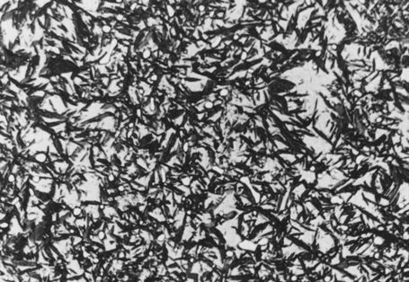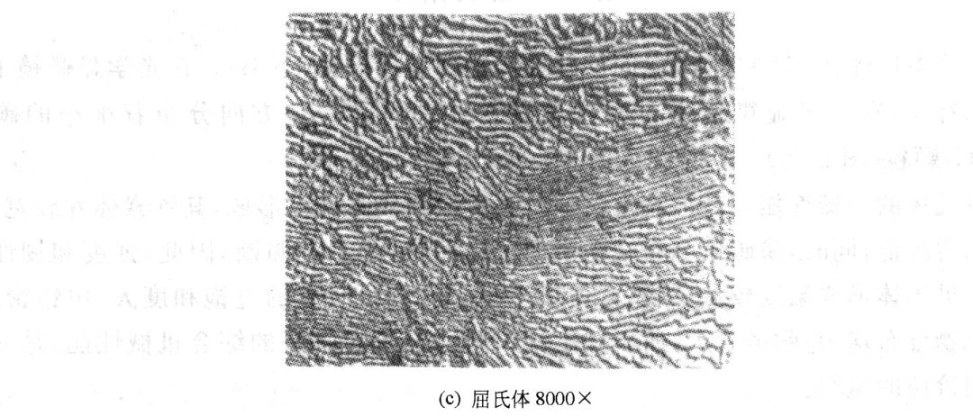 回火屈氏體經中溫回火產物,其特征是:馬氏體針狀形態將逐步消失,但仍隱約可見(含鉻合金鋼,其合金鐵素體的再結晶溫度較高,故仍保持著針狀形態),析出的碳化物細小,在光鏡下難以分辨清楚,只有電鏡下才可見到碳化物顆粒,他極易受侵蝕而使組織變黑。如果回火溫度偏上限或保留時間稍長,則使針葉呈白色;此時碳化物偏聚于針葉邊緣,這時鋼的硬度稍低,且強度下降。