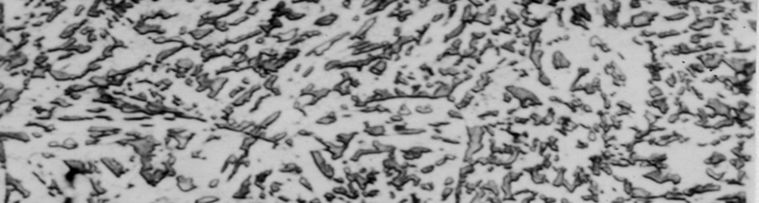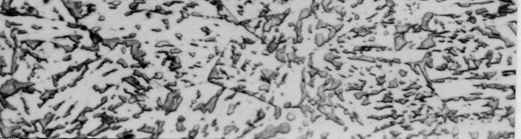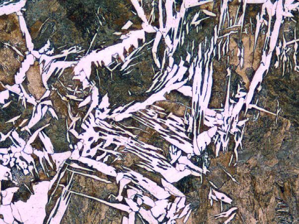 羽毛狀貝氏體,基體為鐵素體,條狀碳化物于鐵素體片邊緣析出。