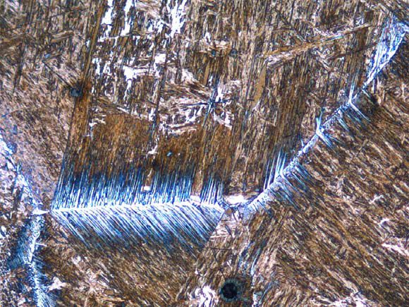 亞共析鋼加熱時因過熱而形成粗晶,冷卻時又快,故鐵素體除沿奧氏體晶界成網狀析出外,還有一部分鐵素體從晶界向晶內按切變機制形成并排成針狀獨自析出,這種分布形態的組織稱為魏氏組織。