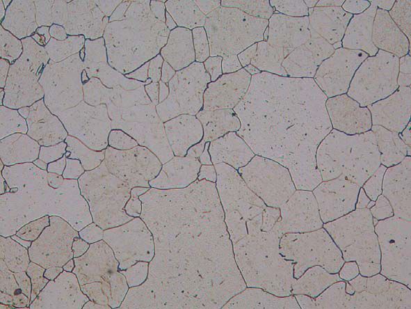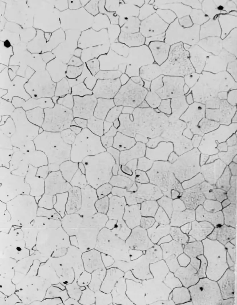 屬bcc結構,呈等軸多邊形晶粒分布。鐵素體軟而韌,硬度為30~100HB。在碳鋼中它是碳在α-Fe中的固溶體;在合金鋼中,則是碳和合金元素在α-Fe中的固溶體。碳在α-Fe中的溶解量很低,在AC1溫度,碳的最大溶解量為0.0218%,但隨溫度下降的溶解度則降至0.0084%,因而在緩冷條件下鐵素體晶界處會出現三次滲碳體。隨鋼中碳含量增加,鐵素體量相對減少,珠光體量增加,此時鐵素體則是網絡狀和月牙狀。