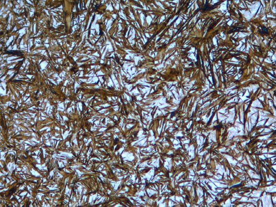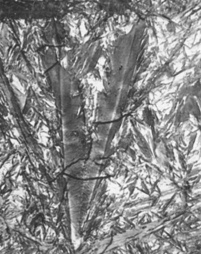 針狀馬氏體,又稱片狀馬氏體或高碳馬氏體,它的基本特征是:在一個奧氏體晶粒內形成的第一片馬氏體片較粗大,往往貫穿整個晶粒,將奧氏體晶粒加以分割,使以后形成的馬氏體大小受到限制,因此片狀馬氏體的大小不一,分布無規則。針狀馬氏體按一定方位形成。在馬氏體針葉中有一中脊面,碳量越高,越明顯,且馬氏體也越尖,同時在馬氏體間伴有白色殘留奧氏體。
