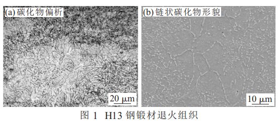 退火態是 H13 鋼的供貨組織狀態,其退火組織優劣直接影響材料的使用性能。與進口 H13 鋼相 比,國產 H13 鋼仍存在一些質量差距,退火質量問題主要表現為碳化物尺寸不均、 圓整度差及分布不均勻等。其中,鏈狀碳化物是 H13 鋼退火組織中較為常見且危害較大的一種組織缺陷, 沿晶分布的碳化物將顯著降低材料的沖擊韌性和耐磨性, 造成模具型腔邊緣或局部塌陷,出現早期失效[4]。為此,通 過合理的熱處理工藝,有效消除 H13 鋼退火組織中的鏈狀碳化物,獲得碳化物細小、均勻的退火組織,對提高材料力學性能和模具使用壽命均具有重要的現實意義。