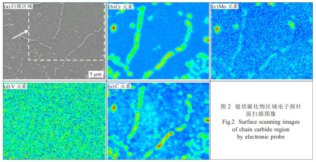 圖 1 為 H13 鋼鍛材退火組織。由圖 1(a)可以看 出,退火組織為碳化物分布不均勻的粒狀珠光體,顏色較深位置為碳化物聚集區域,碳化物數量較多、尺寸細小;顏色較淺位置為碳化物貧化區,其碳化物尺寸較大,且沿晶呈鏈狀分布。由圖 1(b)可觀察到,沿晶分布的鏈狀碳化物形貌呈條片狀, 尺寸范圍約為3~5μm,局部區域出現鏈狀碳化物的閉合網絡;其余位置的碳化物呈大小不一的顆粒狀, 且分布更為彌散均勻。按 NADCA# 207-2003 標準可評定該退火組織為 AS16 級,屬不合格級別。對鏈狀碳化物區域進行 EPMA 電子探針分析,其面掃描圖像如圖 2 所 示。沿晶的鏈狀碳化物中主要為 Cr 和 Mo 的碳化物富集。研究表明,H13 鋼退火組織中 Cr 和 Mo 的碳 化物主要以 M23C6 和 M6C 形式存在[5-6]。