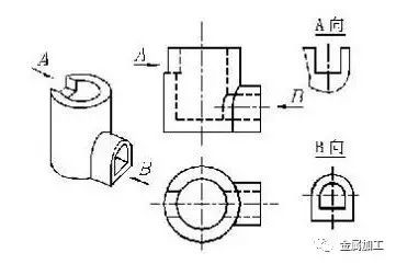 (2)必須用帶字母的箭頭指明投影部位及方向,并在該局部視圖上方用相同的字母標注局部視圖的名稱,如“A向”、“B向”等。