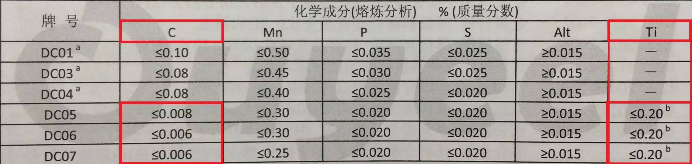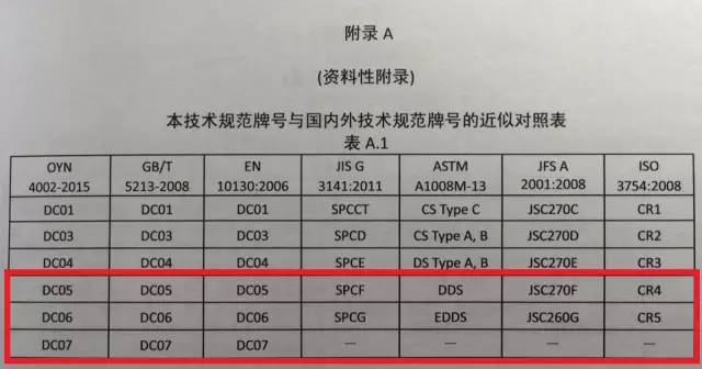 我們看看低碳鋼里哪些牌號符合要求(摘自【歐冶規范】),照片里已經用紅框框出來了:DC05、DC06、DC07,大家回憶下,這幾個牌號是不是“特能沖”呢?