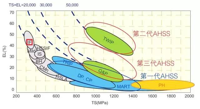 IF鋼處于坐標系的左上方,可以看到他的延伸率(EL)基本上是最高的。