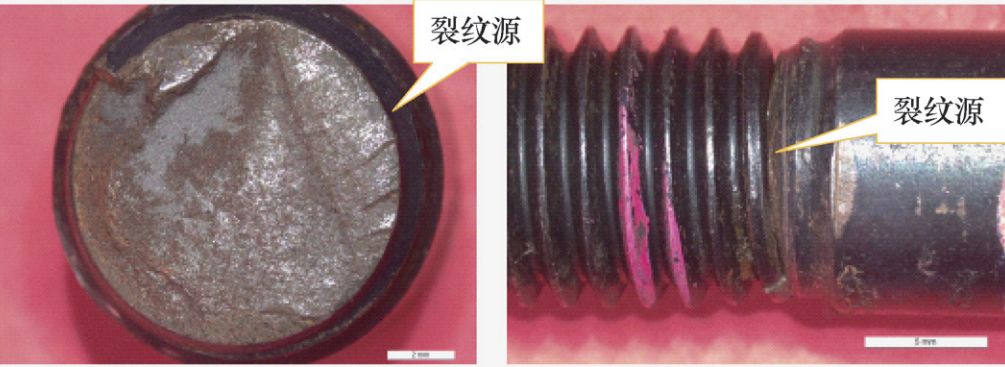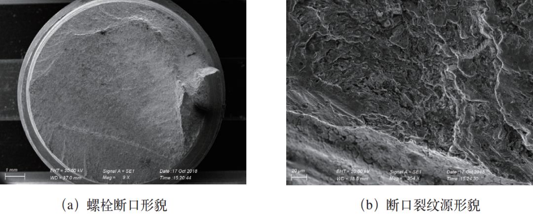 螺栓斷口裂紋起源位于螺栓中部螺桿與螺紋過渡處的第一個螺紋根部,如圖2所示。斷口未見明顯塑性變形,斷口表面局部磨損,裂紋源及擴展區平整隱約可見貝紋線,瞬斷區存在一較小區域的剪切唇,為韌性斷裂。宏觀特征可以判斷螺栓斷裂模式為疲勞斷裂。