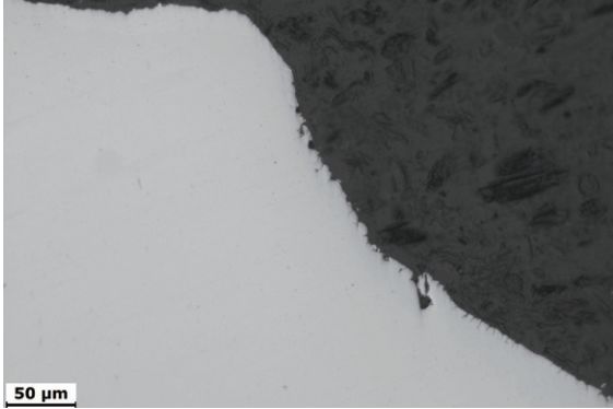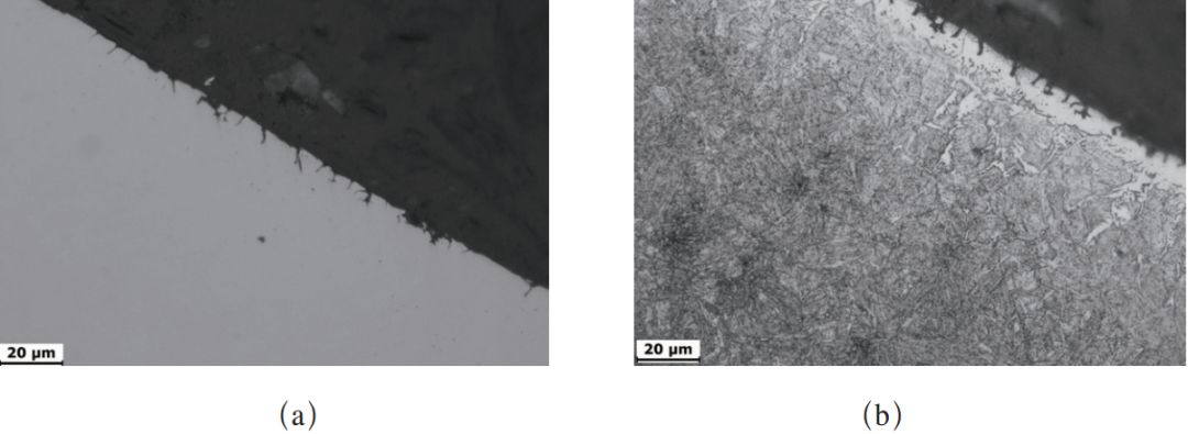 圖4~圖6為裂紋源區斷面拋光態及侵蝕態形貌,裂紋源及擴展區斷面較為平整。螺栓表面存在脫碳現象,裂紋源附近表面存在大量細小裂紋,大多數裂紋位于螺栓表面全脫碳層,全脫碳層深度約為10.19μm。斷口裂紋擴展區較平整,裂紋擴展方式為穿晶擴展。最終瞬斷區表面顯微形貌呈鋸齒狀。斷口源區的顯微組織為的鐵素體+回火索氏體,部分鐵素體呈針狀及沿晶分布。