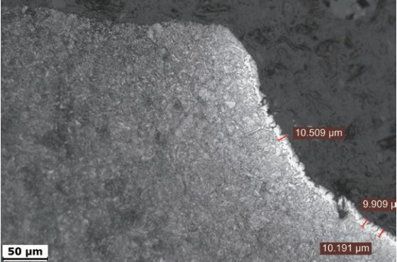 螺栓的化學成分及心部硬度均符合GB/T 3098.1—2010對10.9 級螺栓的技術要求;斷口宏觀及微觀分析可判斷螺栓斷裂模式為疲勞斷裂,裂紋源位于螺栓中部螺桿與螺紋過渡處的第一個螺紋根部,裂紋源處螺紋根部表面存在大量龜裂形貌;金相檢驗表明螺栓表面存在脫碳現象,裂紋源附近表面存在大量微裂紋,微裂紋位于螺栓表面全脫碳層,斷口源區的顯微組織為的鐵素體+回火索氏體,基體顯微組織為回火索氏體。裂紋源螺紋根部未見加工變形組織,表明螺栓制造工藝為先加工螺紋后進行熱處理,熱處理過程中造成螺栓表面脫碳,表面形成一厚度約10.19μm的鐵素體層,鐵素體的存在降低了螺栓表面的疲勞強度,容易產生疲勞裂紋。螺栓的斷裂模式為疲勞斷裂,裂紋起源于螺栓桿部與螺紋過渡處的第一個螺紋根部,第一個螺紋根部存在較大應力集中,螺栓表面存在全脫碳現象,降低了螺栓表面的強度,在安裝使用過程中容易萌生裂紋,在交變應力作用下,裂紋以疲勞方式擴展,當裂紋擴展至剩余截面不能承受工作應力時,發生斷裂。螺栓表面存在完全脫碳層,降低了螺栓表面的疲勞強度,裂紋于螺栓桿部與螺紋過渡處第一個螺紋根部的應力集中處萌生,在交變應力作用下,裂紋以疲勞方式擴展,當裂紋擴展至剩余截面不能承受工作應力時,發生斷裂。建議在螺栓熱處理時進行氣體保護,防止螺栓表面脫碳,或先進行熱處理再進行螺紋的加工。