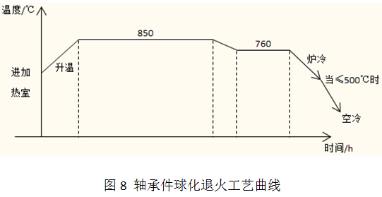 球化退火設備通常使用保護氣氛爐,使退火后的零件表面少、無氧化,并能提高軸承零件的材料利用率。軸承材料的加熱溫度為835~850℃,球化溫度為750~760℃,如圖8所示。