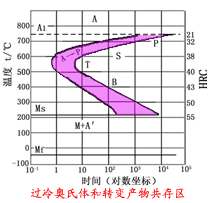 實(shí)際生產(chǎn)中,奧氏體冷卻速度較快,必須過(guò)冷到A1溫度以下才開(kāi)始轉(zhuǎn)變。在相變溫度A1以下還沒(méi)有發(fā)生轉(zhuǎn)變而處于不穩(wěn)定狀態(tài)的奧氏體稱過(guò)冷奧氏體。