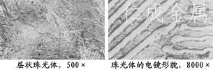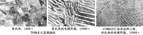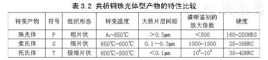 共析鋼過(guò)冷奧氏體在A1~550℃范圍內(nèi)等溫轉(zhuǎn)變,由于在該范圍內(nèi)轉(zhuǎn)變溫度比較高,奧氏體能全部分解,最后得到鐵素體和滲碳體所組成的機(jī)械混合物。在此溫度范圍內(nèi),由于過(guò)冷度不同,鐵素體和滲碳體的片層間距也不相同。轉(zhuǎn)變溫度越低,過(guò)冷度越大,片層間距越小,其強(qiáng)度和硬度就越高,塑性、韌性也有所改善。根據(jù)片層間距的大小,將珠光體型轉(zhuǎn)變產(chǎn)物通常又分為珠光體、索氏體和托氏體三種(見(jiàn)下表)。