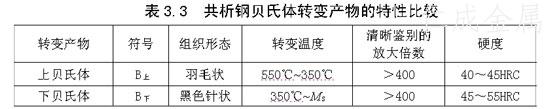 共析鋼過(guò)冷奧氏體在550℃~MS范圍內(nèi)(即從C曲線“鼻尖”處到MS線)等溫轉(zhuǎn)變成貝氏體,用符號(hào)“B”表示。由于在該范圍內(nèi)轉(zhuǎn)變溫度比較低,過(guò)冷度比較大,因而形成過(guò)飽和碳的鐵素體與碳化物組成的兩相機(jī)械混合物,即貝氏體。根據(jù)等溫轉(zhuǎn)變溫度和產(chǎn)物的組織形態(tài)不同,貝氏體又分為上貝氏體和下貝氏體兩種,分別用“B上”和“B下”表示。上貝氏體的等溫轉(zhuǎn)變溫度為550℃~350℃,其組織呈羽毛狀,強(qiáng)度、塑性、韌性較差,基本無(wú)實(shí)用價(jià)值。下貝氏體的等溫轉(zhuǎn)變溫度為350℃~MS,其組織呈黑色針片狀,具有較高的硬度、強(qiáng)度和耐磨性,同時(shí)塑性、韌性也良好,生產(chǎn)上常采用等溫淬火獲得高韌性的下貝氏體組織。貝氏體轉(zhuǎn)變產(chǎn)物的組織、性能見(jiàn)下表。