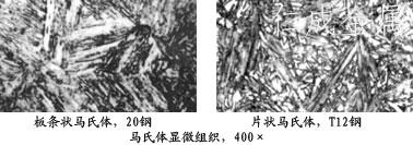 當(dāng)奧氏體中碳含量WC<0.2%時(shí),馬氏體的形態(tài)為板條狀,故板條狀馬氏體又稱為低碳馬氏體,有較好的強(qiáng)韌性;當(dāng)WC>1.0%時(shí),馬氏體的形態(tài)為片狀,故片狀馬氏體又稱為高碳馬氏體,其性能硬而脆;
