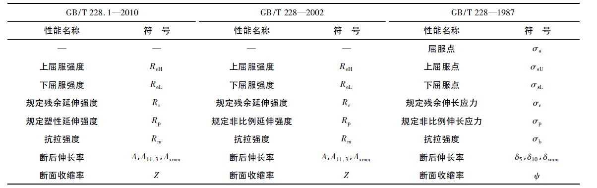 表1為常用力學(xué)性能名稱和符號新舊標(biāo)準(zhǔn)的對照。由表1可見,常用力學(xué)性能的名稱和符號最新的GB/T228.1-2010與2002年的標(biāo)準(zhǔn)相比,只是“規(guī)定非比例延伸強度”的名稱變?yōu)椤耙?guī)定塑性延伸強度”,其他基本沒有變化。但與1987年版的標(biāo)準(zhǔn)相比有較大差異。為與國標(biāo)接軌,2002版開始,力學(xué)性能的名稱及符號均按照國際標(biāo)準(zhǔn)的規(guī)定。如將屈服點名稱改為屈服強度,取消屈服強度的測定,只測定上屈服強度和下屈服強度。強度指標(biāo)的符號發(fā)生了較大的變化,由原來的σ加下角標(biāo)改為R加下角標(biāo)。斷后伸長率、斷面收縮率名稱不變而符號完全不同。