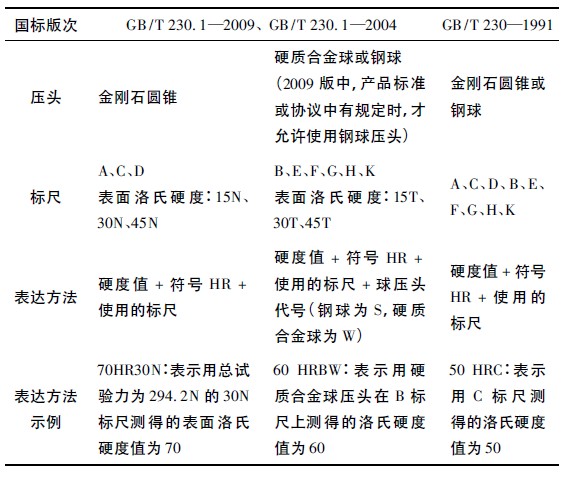 洛氏硬度試驗方法最新的國家標(biāo)準(zhǔn)是2010年4月1日開始實施的GB/T230.1-2009《金屬材料洛氏硬度試驗第1部分:試驗方法(A、B、C、D、E、F、G、H、K、N、T標(biāo)尺)》,該標(biāo)準(zhǔn)修改采用國際標(biāo)準(zhǔn)ISO6508-1:2005《金屬材料洛氏硬度試驗第1部分:試驗方法(A、B、C、D、E、F、G、H、K、N、T標(biāo)尺)》。GB/T230.1于1983年首次發(fā)布,分別于1991、2004和2009年進(jìn)行了三次修訂。表3為洛氏硬度部分內(nèi)容新舊標(biāo)準(zhǔn)的對照。由表3可見,從2004版標(biāo)準(zhǔn)起,增加了15N、30N、45N、15T、30T、45T等6個表面洛氏硬度標(biāo)尺。2004年前壓頭為金剛石圓錐或鋼球兩種,而2004版規(guī)定,壓頭除了這兩種以外,還可以使用硬質(zhì)合金球壓頭。但在2009版中規(guī)定,一般只允許使用金剛石圓錐或硬質(zhì)合金球兩種壓頭,且在“范圍”中明確說明:硬質(zhì)合金球形壓頭為標(biāo)準(zhǔn)型洛氏硬度壓頭,如果在產(chǎn)品標(biāo)準(zhǔn)或協(xié)議中有規(guī)定時,允許使用鋼球壓頭。因此,為了區(qū)別洛氏硬度試驗所使用的壓頭類型,從2004版標(biāo)準(zhǔn)起對于使用球形壓頭標(biāo)尺,在硬度符號后面要追加符號“S”或“W”,見表3中表達(dá)方法及其示例。如“60HRB”的表達(dá)方法,在2004年前是規(guī)范表達(dá),但2004及2009版標(biāo)準(zhǔn)中就是不規(guī)范的表達(dá),必須說明球壓頭代號。