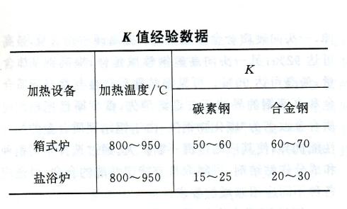 (2)加熱時間(s) %26tau;=KD 式中D為工件厚度,mm;K為系數(shù),工廠經(jīng)驗數(shù)據(jù)如表。