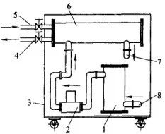 (1)小型淬火槽配換熱器,這種結(jié)構(gòu)是將換熱器直接安裝在淬火槽內(nèi)的導(dǎo)流桶中,如圖2 所示。